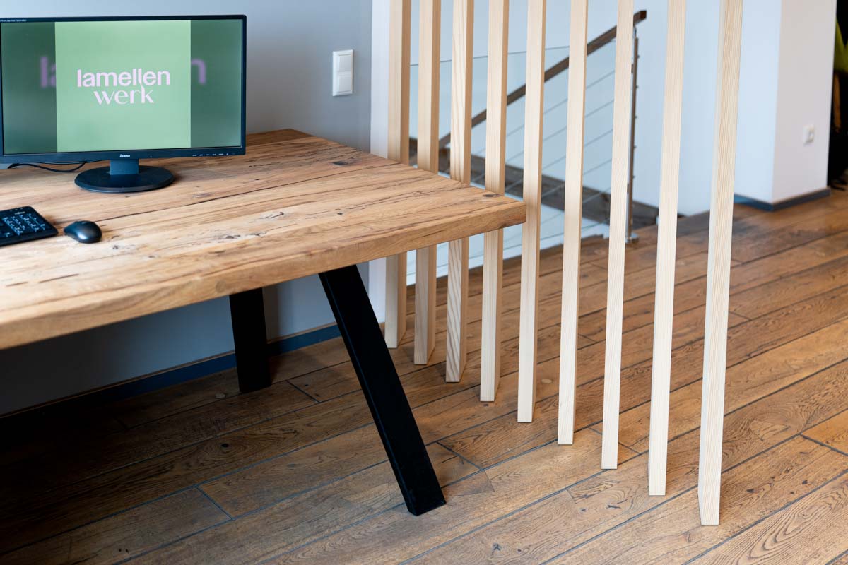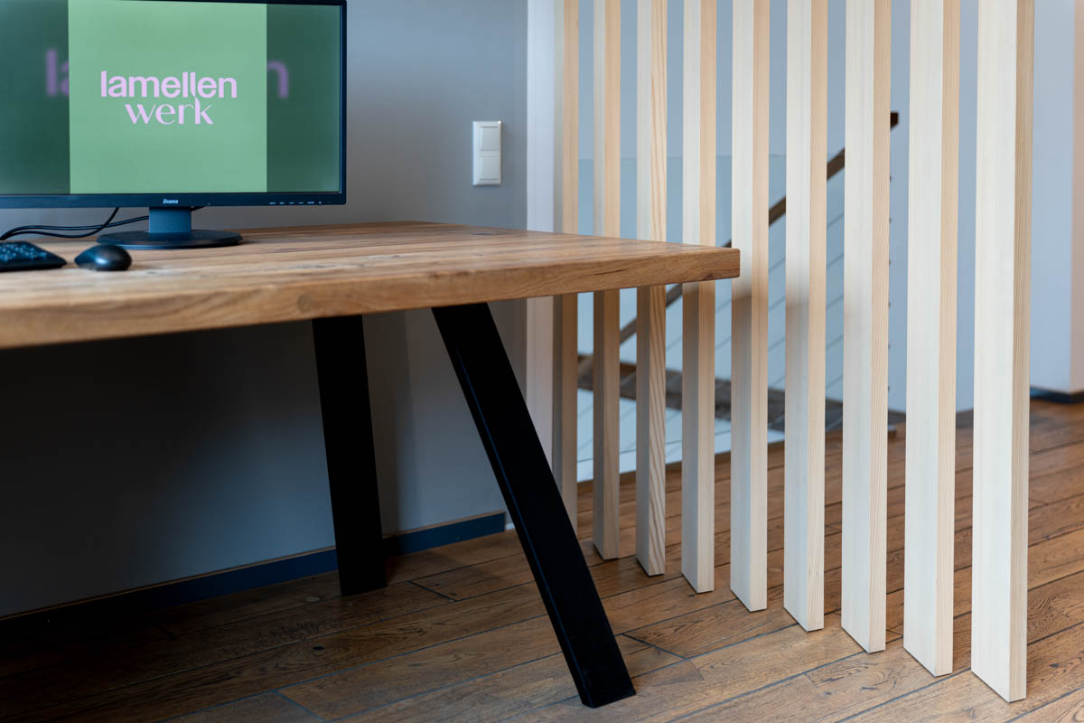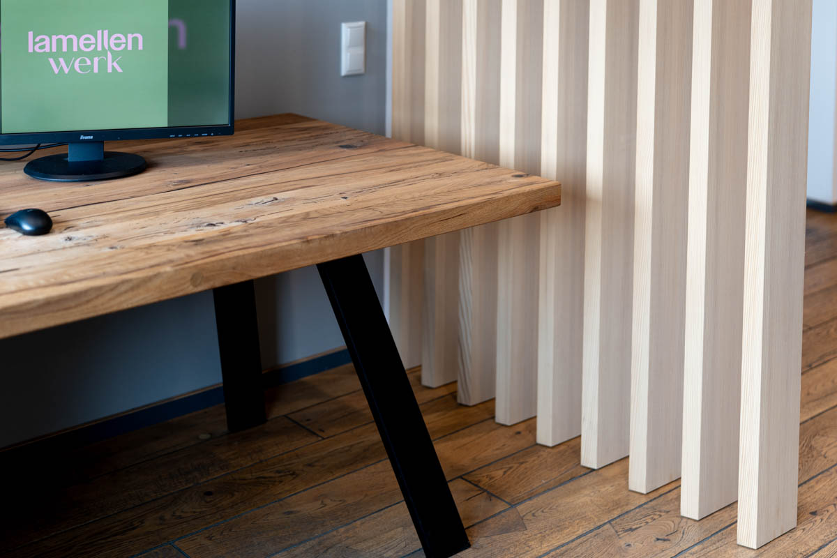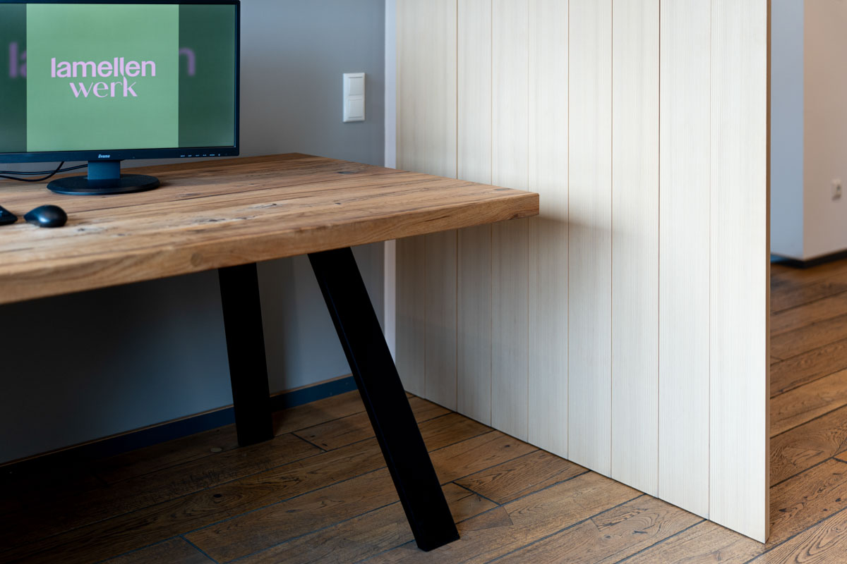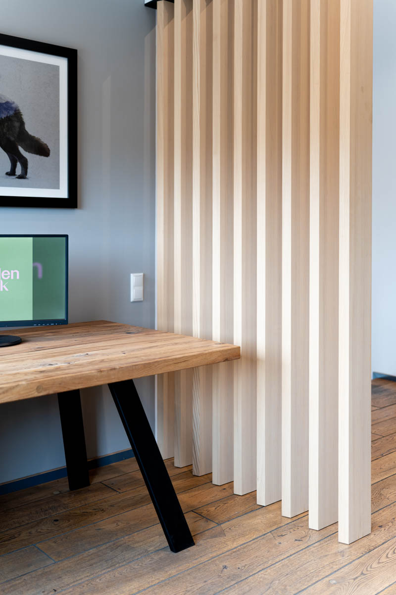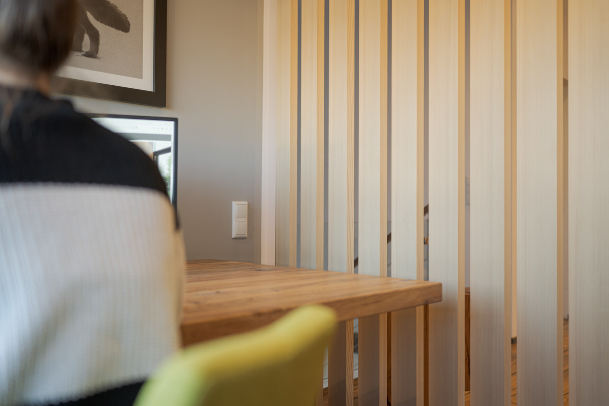 Eine leichte und flexible Lösung, mit einer drehbaren Lamellenwand aus einer offenen Raumsituation schnell einen geschlossenen temporären Arbeitsplatz zu schaffen. Ideal für konzentriertes Arbeiten in Wohn- oder Bürobereichen.
