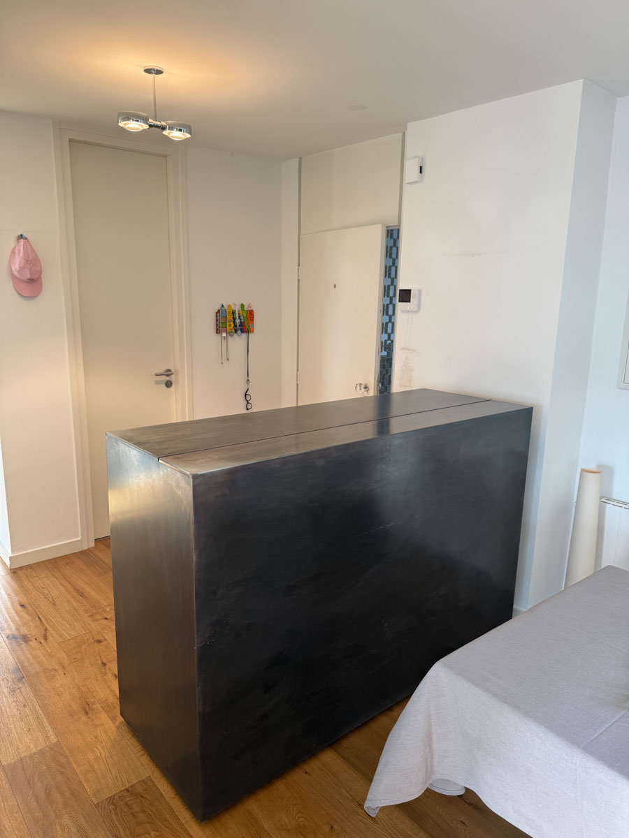 Bei diesem Projekt wurde unsere drehbare Holz-Lamellenwand in einem Loft zwischen einem Sideboard und Decke montiert, um den offenen Eingangsbereich temporär vom Wohnbereich abtrennen zu können.