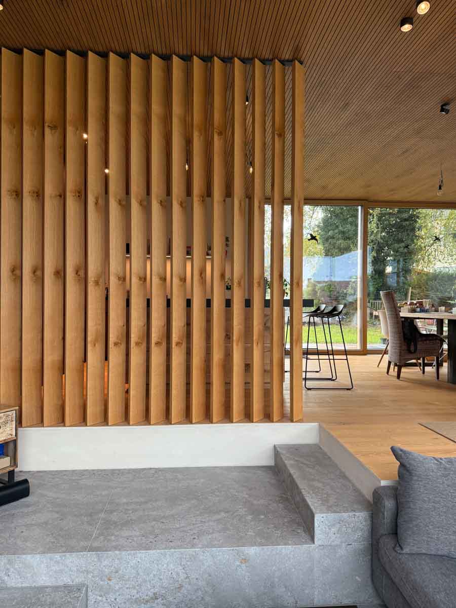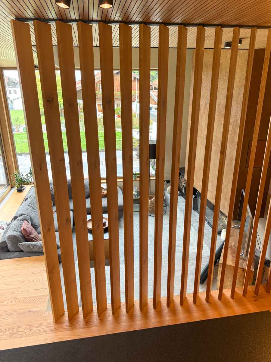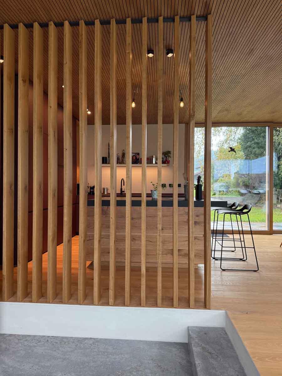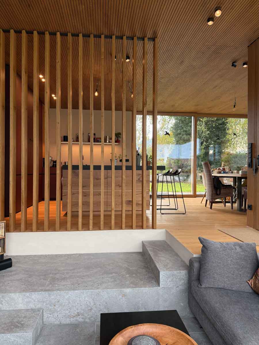 Abtrennung der Küche vom abgesenkten Wohnbereich. Durch die verstellbaren Lamellen kann je nach Stellung immer wieder eine neue Wohnsituation geschaffen werden – offen, halbtransparent oder geschlossen.