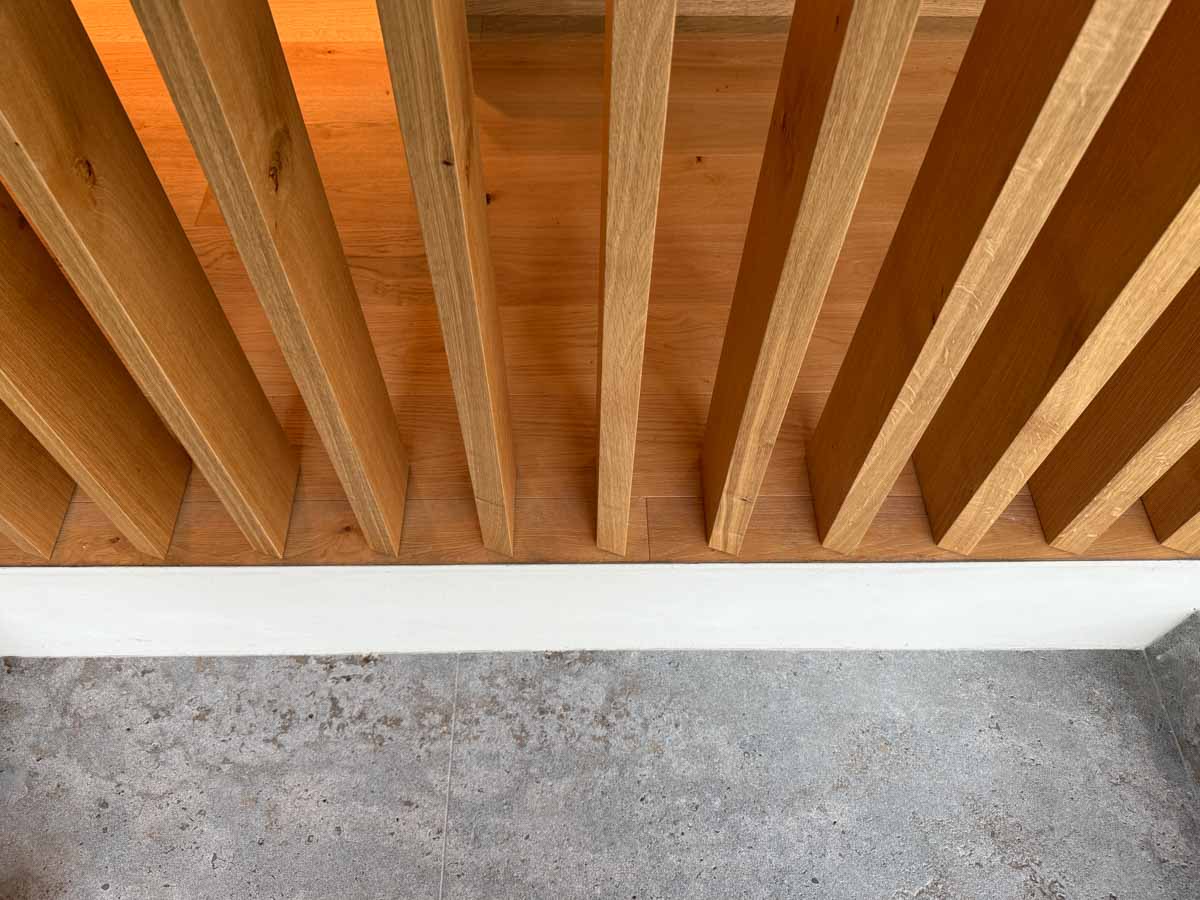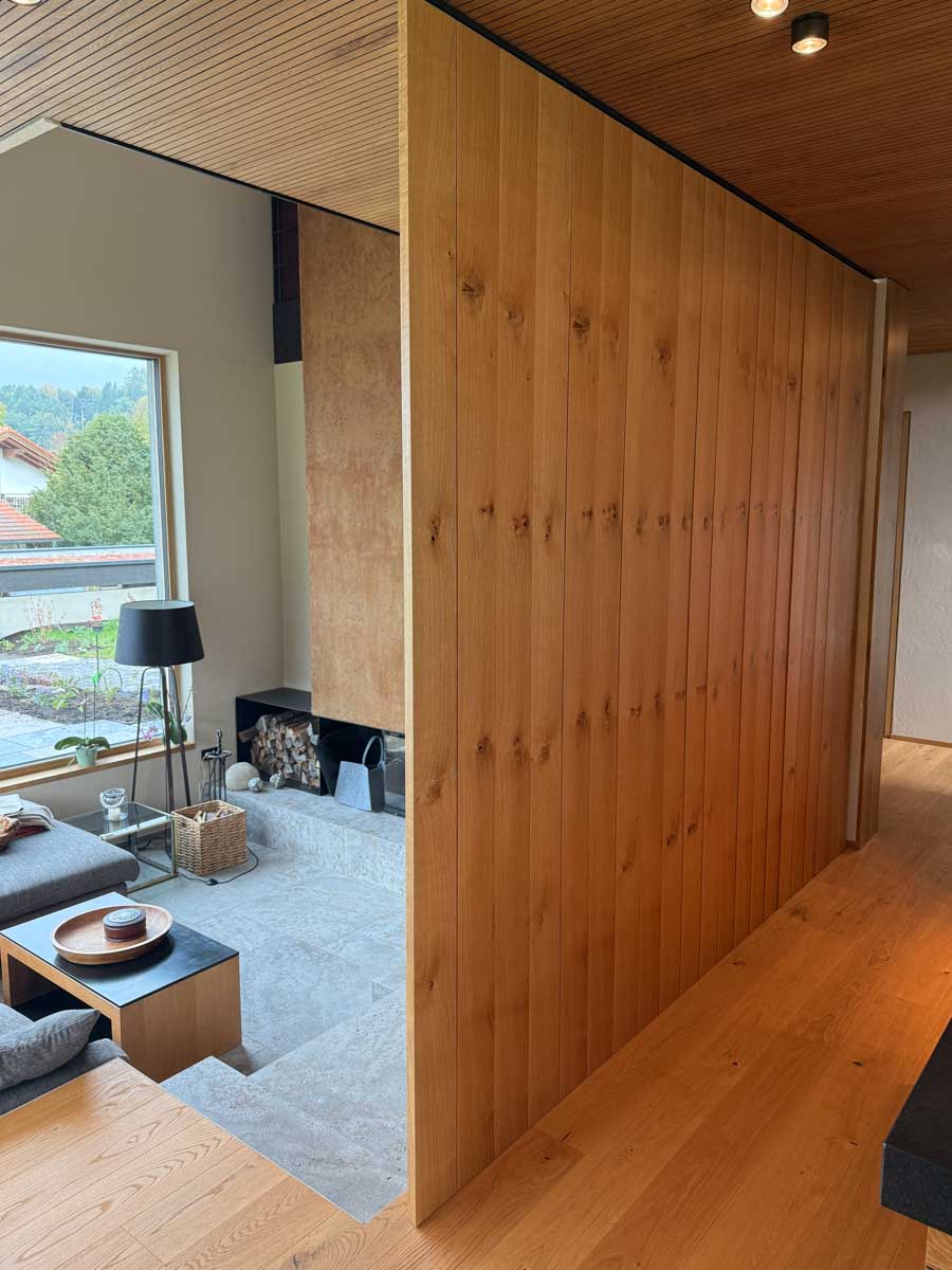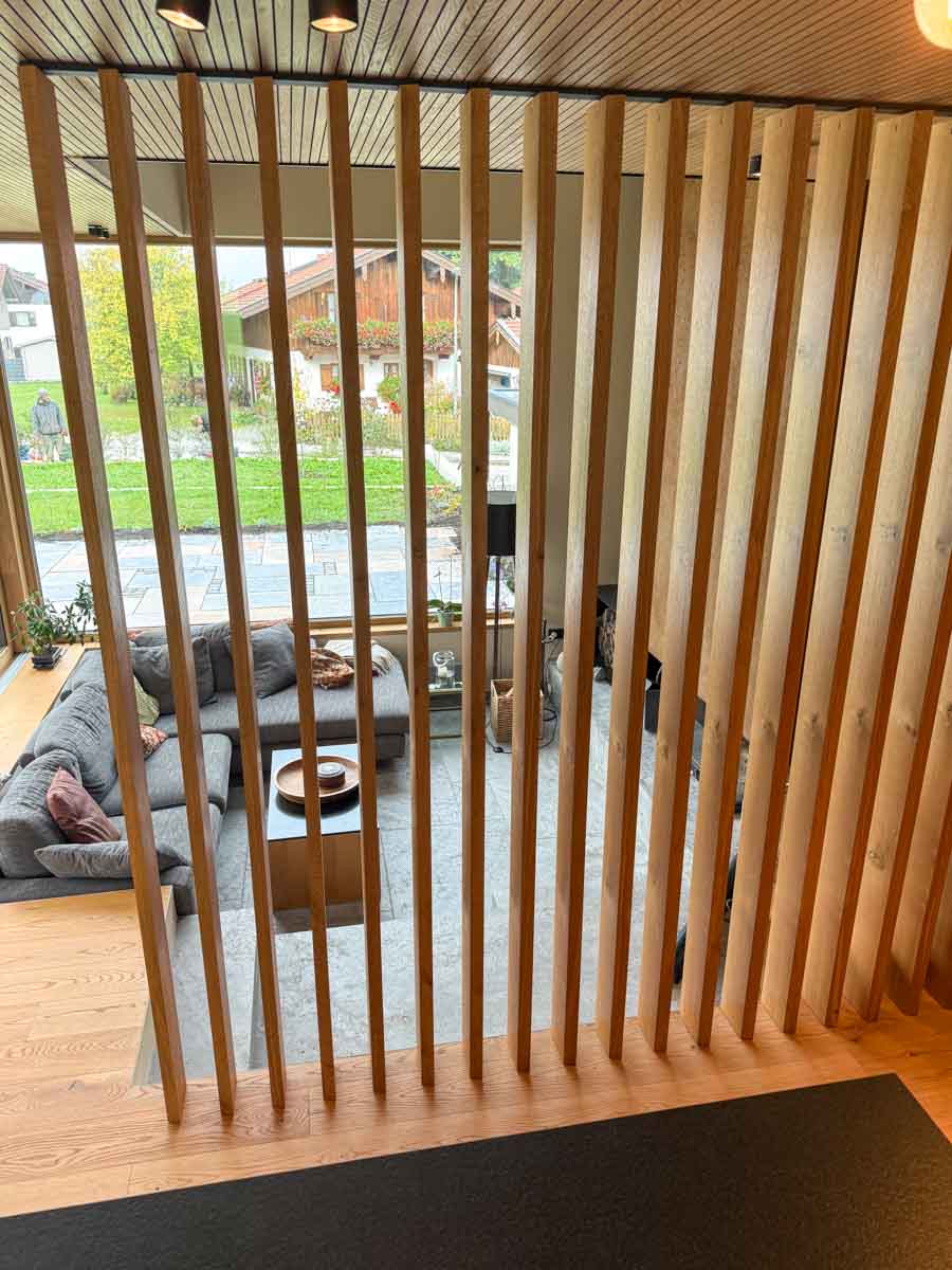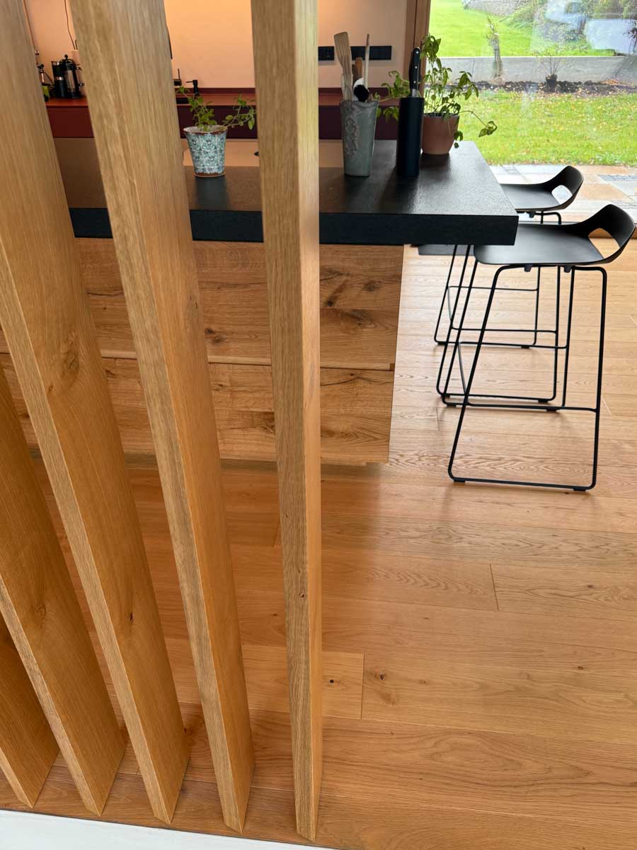 Abtrennung der Küche vom abgesenkten Wohnbereich. Durch die verstellbaren Lamellen kann je nach Stellung immer wieder eine neue Wohnsituation geschaffen werden – offen, halbtransparent oder geschlossen.