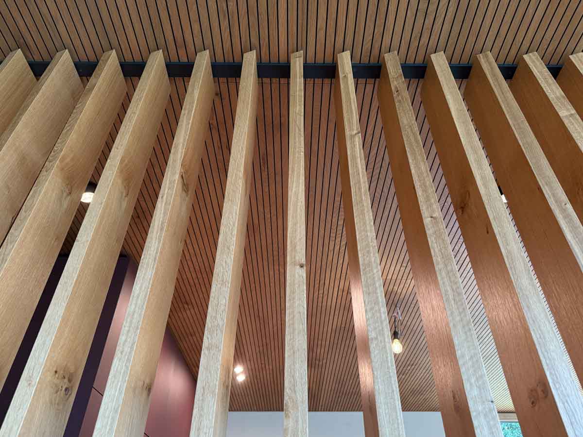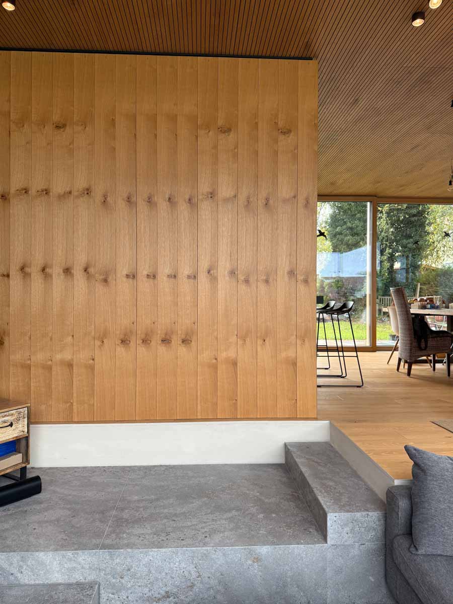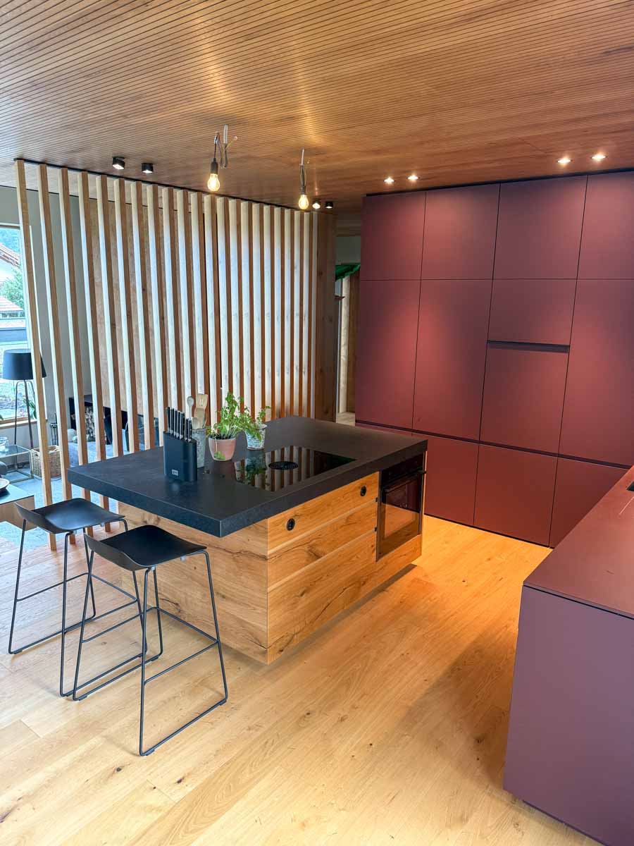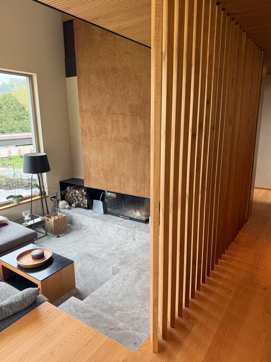 Abtrennung der Küche vom abgesenkten Wohnbereich. Durch die verstellbaren Lamellen kann je nach Stellung immer wieder eine neue Wohnsituation geschaffen werden – offen, halbtransparent oder geschlossen.